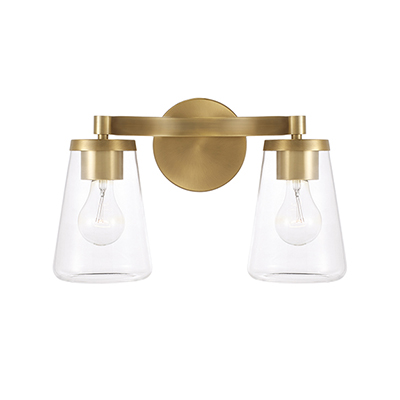 A graceful, curved arm and clear glass create the Aaron 2-Light Vanity for HomePlace. The tapered cylindrical shades bring refined style with optimal light output, while the Aged Brass finish adds elegance to the classic silhouette. Also available in a 3-Light.