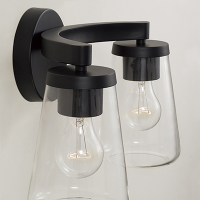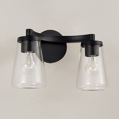 A graceful, curved arm and clear glass create the Aaron 2-Light Vanity for HomePlace. The tapered cylindrical shades bring refined style with optimal light output, while the Matte Black finish punctuates the classic silhouette. Also available in a 3-Light.