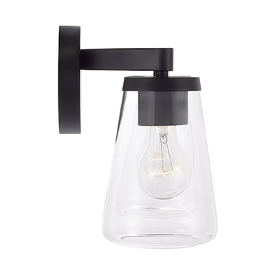 - • DETAILS: Held by a curved arm, the tapered clear glass shades create classic style with a bold Matte Black finish.
