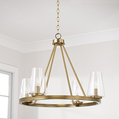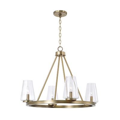 Classic curves and clear glass create the Aaron 4-Light Small Chandelier for HomePlace. The tapered cylindrical shades bring refined style with optimal light output, while the Aged Brass finish adds elegance to the ring silhouette. Also available in a 6-Light.