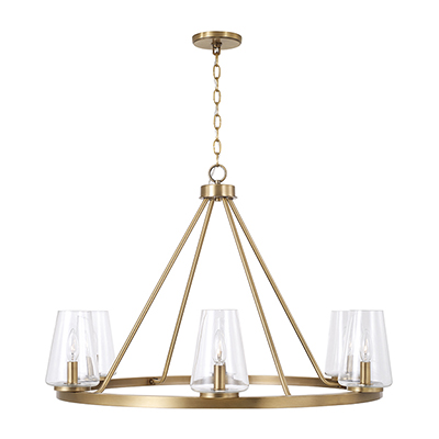 Classic curves and clear glass create the Aaron 6-Light Medium Chandelier for HomePlace. The tapered cylindrical shades bring refined style with optimal light output, while the Aged Brass finish adds elegance to the ring silhouette. Also available in a 4-Light.