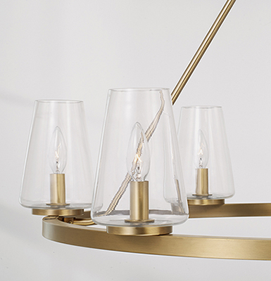 - • DETAILS: In a traditional ring silhouette, the tapered clear glass shades create classic style with an elegant Aged Brass finish.