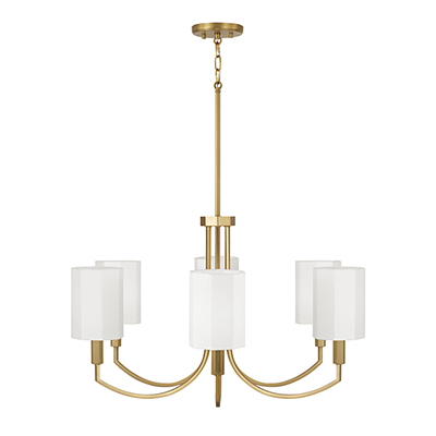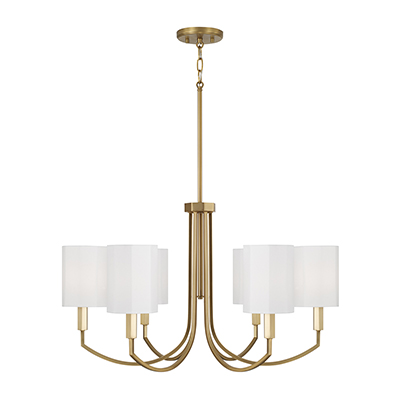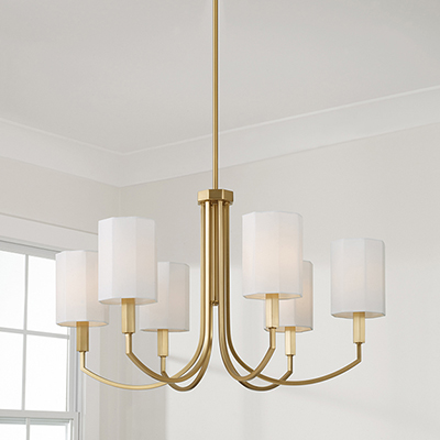 Geometrically inspired, the Adrian Medium Chandelier brings a structural silhouette with high style. The White fabric octagonal shades and faceted candle sleeves create striking dimension, while the Aged Brass finish adds a classic touch.