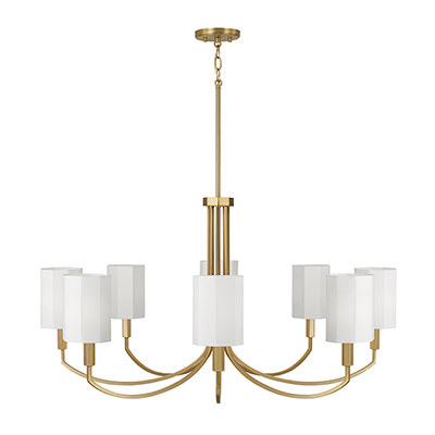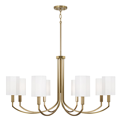 Geometrically inspired, the Adrian Large Chandelier brings a structural silhouette with high style. The White fabric octagonal shades and faceted candle sleeves create striking dimension, while the Aged Brass finish adds a classic touch.