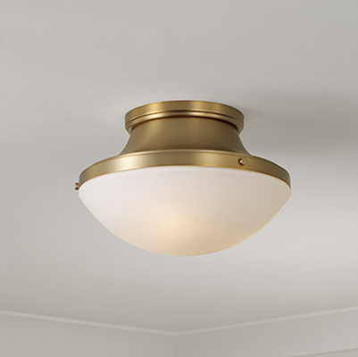 - • DETAILS: An Aged Brass finish and Soft White glass dome come together to form a flared drop silhouette, complete with subtle rivet details.
