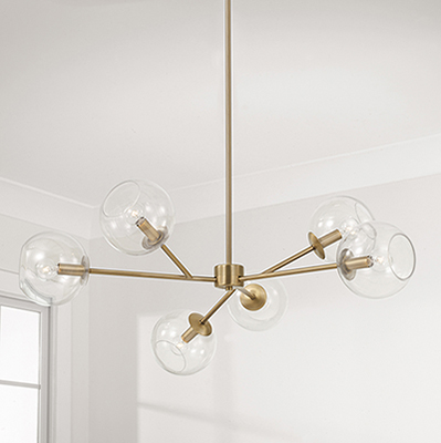 The Atlas Chandelier combines modern structure with asymmetrical balance. The open globe clear glass shades look almost effervescent on the sleek, juxtaposed arm branches. Finished in Aged Brass for a classic aesthetic.