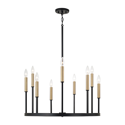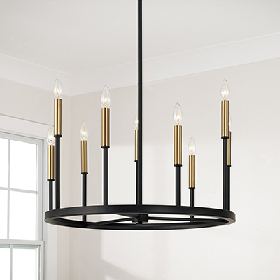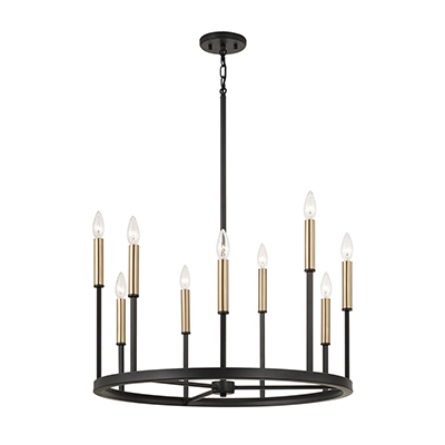 Grounded in a dark Espresso finish, the Davis 26 inch Small Chandelier creates handsome, tailored style with clean lines and a classic ring silhouette. The cylindrical candle sleeves are easy to swap with both Espresso and Brass options included for a two-tone or monochrome look.