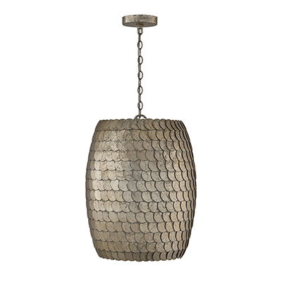 Handcrafted overlapping metal discs bring stunning texture to the Delphine 15 inch Medium Pendant. Each disc beautifully attracts the light in its own way, creating a sense of motion on the curved cylindrical silhouette. The Grecian Pewter finish adds visual dimension, while the real Alabaster diffuser illuminates a soft, natural glow.