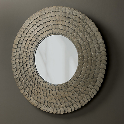 Handcrafted overlapping metal discs bring stunning texture to the Delphine 32.5 inch Mirror. With the visual character of the Grecian Pewter finish, each disc beautifully attracts the light in its own way, creating a sense of motion on the circular silhouette.