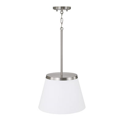 Invite classic style to any space with the Drake Pendant for HomePlace. The tapered Soft White glass shade creates an ambient glow, while the Brushed Nickel finish adds shine to the clean lines.