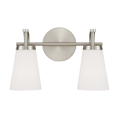 The Drake 2-Light Vanity for HomePlace brings clean and classic style to any space. Paired with sleek, intersecting arms, the tapered Soft White glass shades create an ambient glow, finished in Brushed Nickel for versatile style.