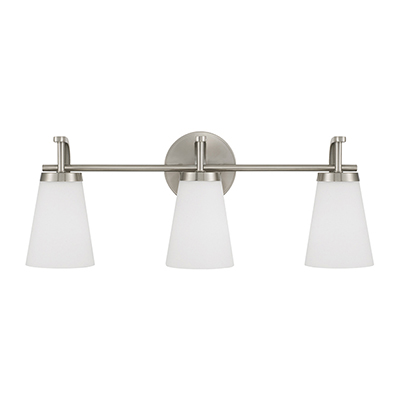 The Drake 3-Light Vanity for HomePlace brings clean and classic style to any space. Paired with sleek, intersecting arms, the tapered Soft White glass shades create an ambient glow, finished in Brushed Nickel for versatile style.