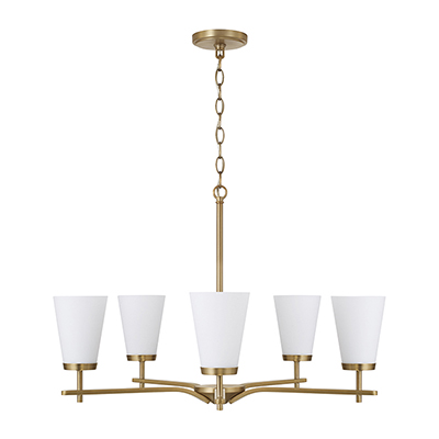 The Drake 5-Light Small Chandelier for HomePlace brings clean and classic style to any space. Paired with sleek, intersecting arms, the tapered Soft White glass shades create an ambient glow, finished in Aged Brass for sophisticated style.
