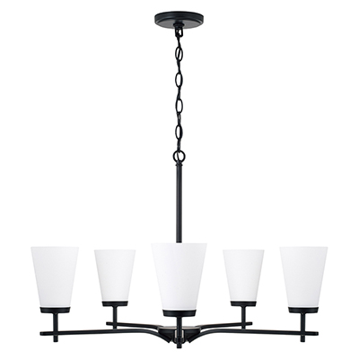 The Drake 5-Light Small Chandelier for HomePlace brings clean and classic style to any space. Paired with sleek, intersecting arms, the tapered Soft White glass shades create an ambient glow, finished in Matte Black for contemporary style.