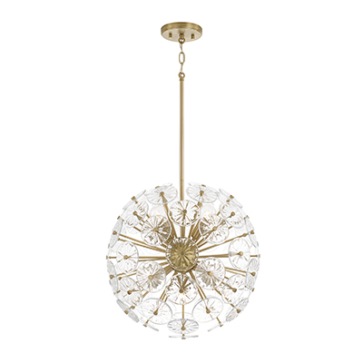 In a starburst of pressed glass petals, the Emelie Pendant creates an effervescent presentation of nature-inspired design. The handcrafted, clear patterned glass offers stunning illumination, perfectly complemented by the Matte Brass stems for gorgeous, statement-making style.