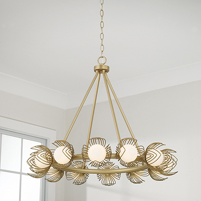 Romantic and artful, the Flora Medium Chandelier exudes botanical charm in a classic ring silhouette. Soft White glass globes are surrounded by delicate metal flower petals, finished in our signature Buffed Gold to bring a vibrant, warm hue to this showstopping style.