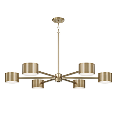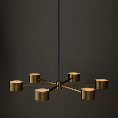The Henley Large Chandelier delivers modern functionality in a sophisticated silhouette. Housed by concise cylindrical forms, the integrated LEDs offer simultaneous up and down light, while the Aged Brass finish creates stunning shine from every angle.