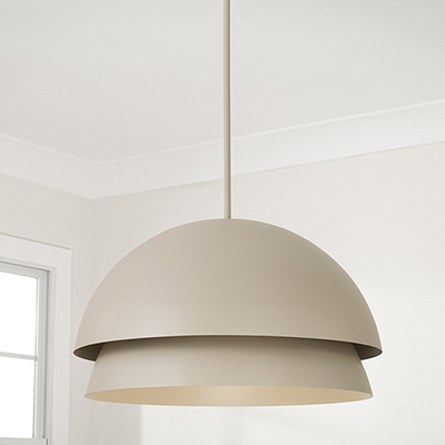 With a nod to Scandinavian style, the Jensen Large Pendant highlights smooth, metal forms and a calming hue. The matte Taupe finish beautifully complements the geometric nestled domes, while the Soft White glass globe creates a serene illumination.