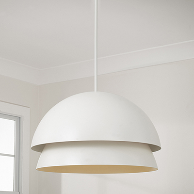 With a nod to Scandinavian style, the Jensen Large Pendant highlights smooth, metal forms and a calming hue. The matte White finish beautifully complements the geometric nestled domes, while the Soft White glass globe creates a serene illumination.