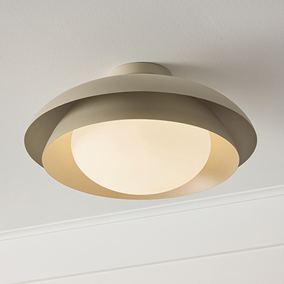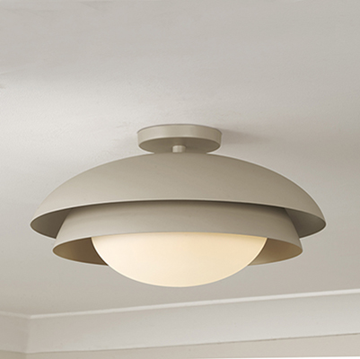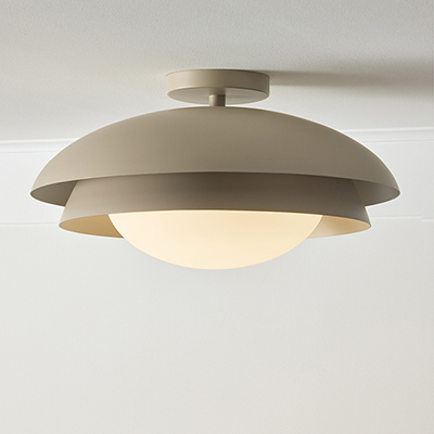 With a nod to Scandinavian style, the Jensen Semi-Flush highlights smooth, metal forms and a calming hue. The matte Taupe finish beautifully complements the geometric nestled domes, while the Soft White glass globe creates a serene illumination.