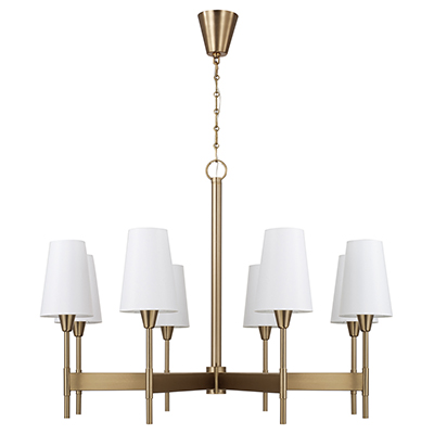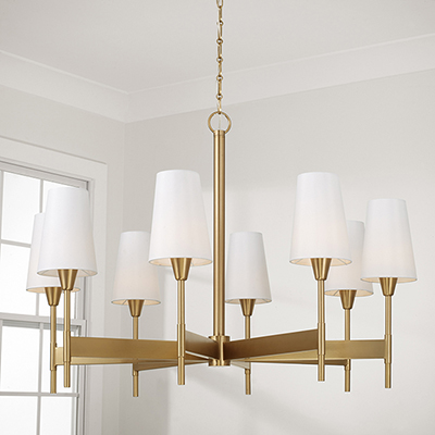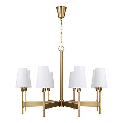 The Leland Large Chandelier exudes transitional design with bold and artful details. The wide lines bring structure to the classic silhouette, punctuated by tapered socket details and White fabric shades. This distinct luminaire is finished in Aged Brass and a unique designer canopy for timeless, elevated style.