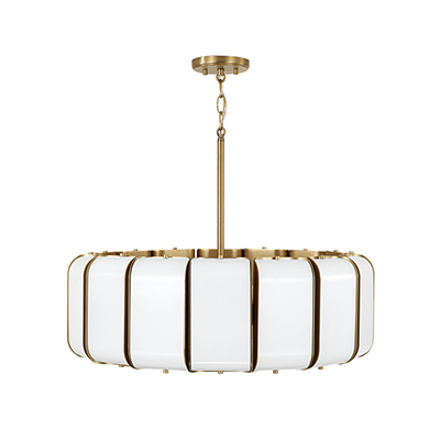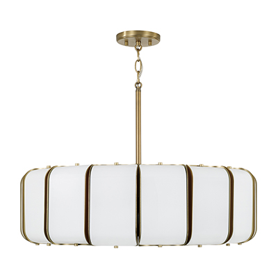 Beautifully multifaceted, the Marcell Large Pendant combines Aged Brass and integrated LEDs with a chic drum silhouette. The curved glass panels of light showcase stunning illumination amongst the metal bases, which add visual interest to this dapper luminaire.