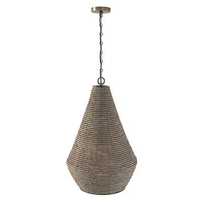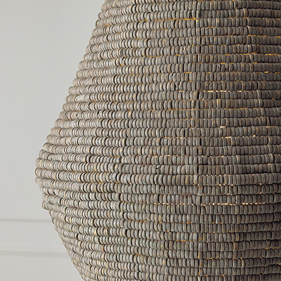 - • DETAILS: With thousands of hand-strung wooden beads, the open teardrop silhouette takes on a stunning dimensional appeal, complete with an inner Soft White glass globe and an Aegean Grey finish.