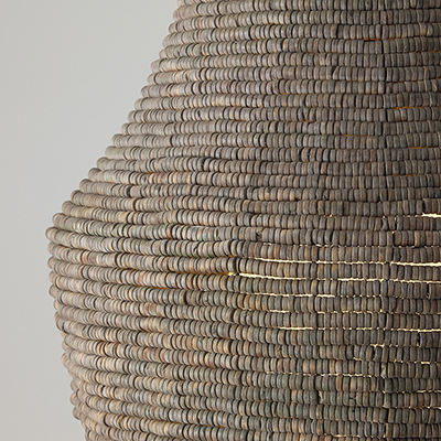 - • DETAILS: With thousands of hand-strung wooden beads, the open vase silhouette takes on a stunning dimensional appeal, complete with an inner Soft White glass globe and an Aegean Grey finish.