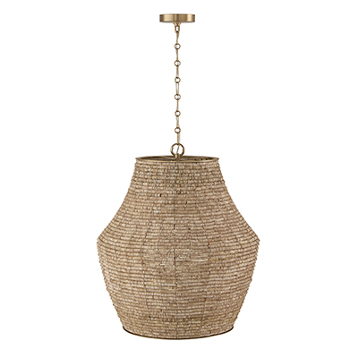 - • FINISH: A combination finish of handcrafted wooden beads painted in varying shades of tan and beige, and a honey-toned gold with subtle shine.