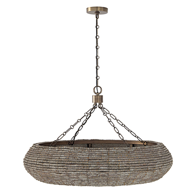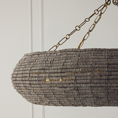 - • DETAILS: With thousands of hand-strung wooden beads, the curved drum ring silhouette takes on a stunning dimensional appeal, complete with an inner Soft White glass globe and an Aegean Grey finish.