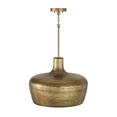 Exploring intricate textures on a gleaming metal shade, the Myriah Medium Pendant brings unique artisan style, with no two pendants exactly the same. Made by hand, the meticulously hammered indented texture creates an eye-catching pattern on the outer shade, harmoniously balanced by the inner shade's softer, circular hammered texture. The Tibetan Brass finish reflects the light beautifully both inside and out, for all-around stunning design.