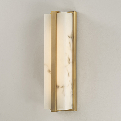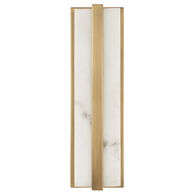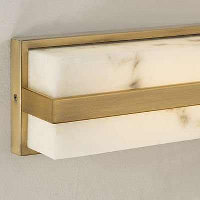 - • DETAILS: Streamlined and sleek, the rectangular form is crafted from Alabaster Glass with a full length Aged Brass backplate and band, plus integrated LED technology.