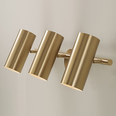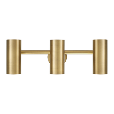 Smooth, cylindrical forms create the Robbie Vanity. Finished in Aged Brass, this contemporary luminaire showcases a touch of contrast with an interior White finish. Each can light pivots to direct the illumination, bringing modern versatility to beautiful task lighting.