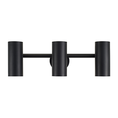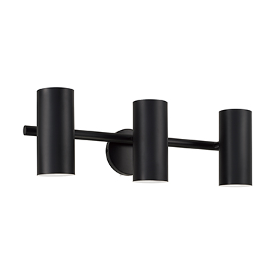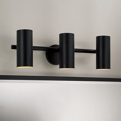 Smooth, cylindrical forms create the Robbie Vanity. Finished in Matte Black, this contemporary luminaire showcases a touch of contrast with an interior White finish. Each can light pivots to direct the illumination, bringing modern versatility to beautiful task lighting.
