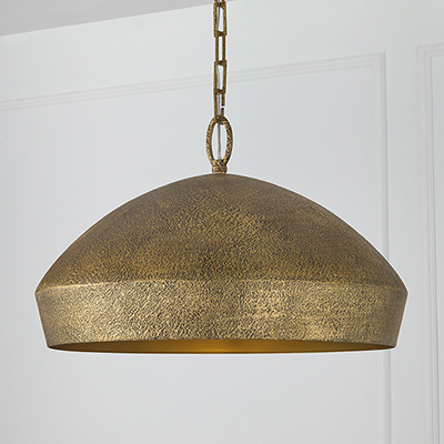 A unique banded dome silhouette and a handcrafted finish form the Savari Medium Pendant. With layers of hand-painted texture, the Artisan Gold finish creates captivating dimension at every glimpse, while the designer chains deliver an elevated aesthetic.