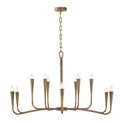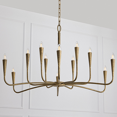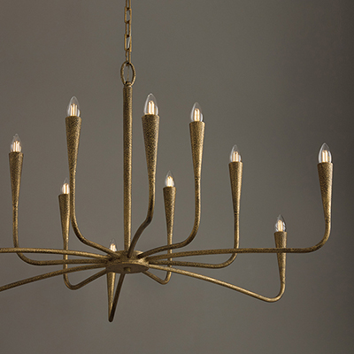 A unique, sweeping silhouette and handcrafted finish form the Savari Grand Chandelier. A smooth transition between arms and candle sleeves gives this luminaire a seamless look, complemented by the elevated aesthetic of slightly sunken sockets and designer chains. With layers of hand-painted texture, the Artisan Gold finish creates captivating dimension at every glimpse.