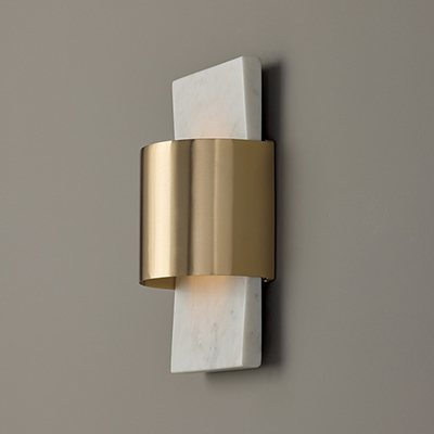- • DETAILS: Handcrafted of a slightly curved natural marble backplate, the sculpted rectangular form invites handsome style with a bold brass cuff. Illuminated by wall-washing LED technology.