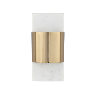 Invite handsome style to any space with the Sidney Sconce. The real white marble slab is slightly curved away from the wall to create an elevated, dimensional effect. Beautifully complemented by the bold brass cuff, the natural material is illuminated by the integrated LED of this wall-washing sconce.