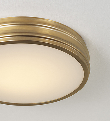 - • DETAILS: Surrounded by a double-rib Aged Brass band, the Soft White glass diffuser brings an ambient glow to any space. Complete with integrated LED technology for maximum impact in a low profile silhouette.