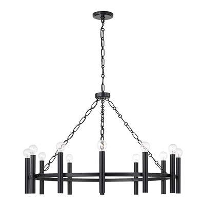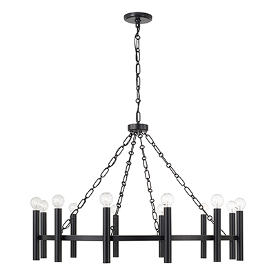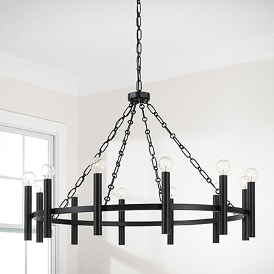 A classic ring silhouette and designer details create the Winton Medium Chandelier. Placed on the outside of the frame, the candle sleeves extend beyond the bottom of the ring, held by alternating loop chains for a unique take on the traditional style. The Matte Black finish punctuates the style.